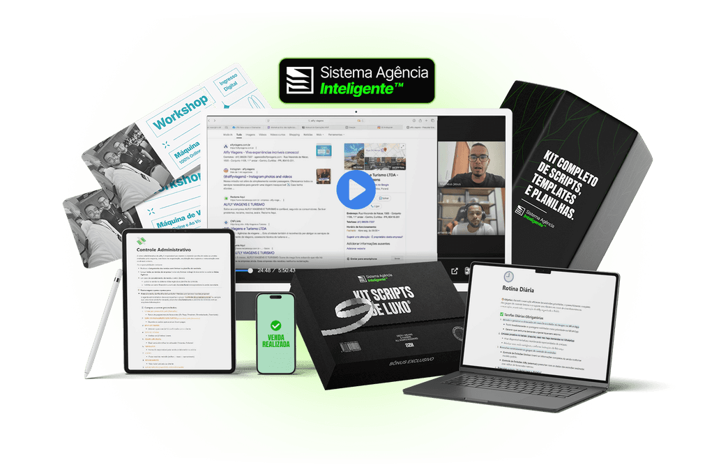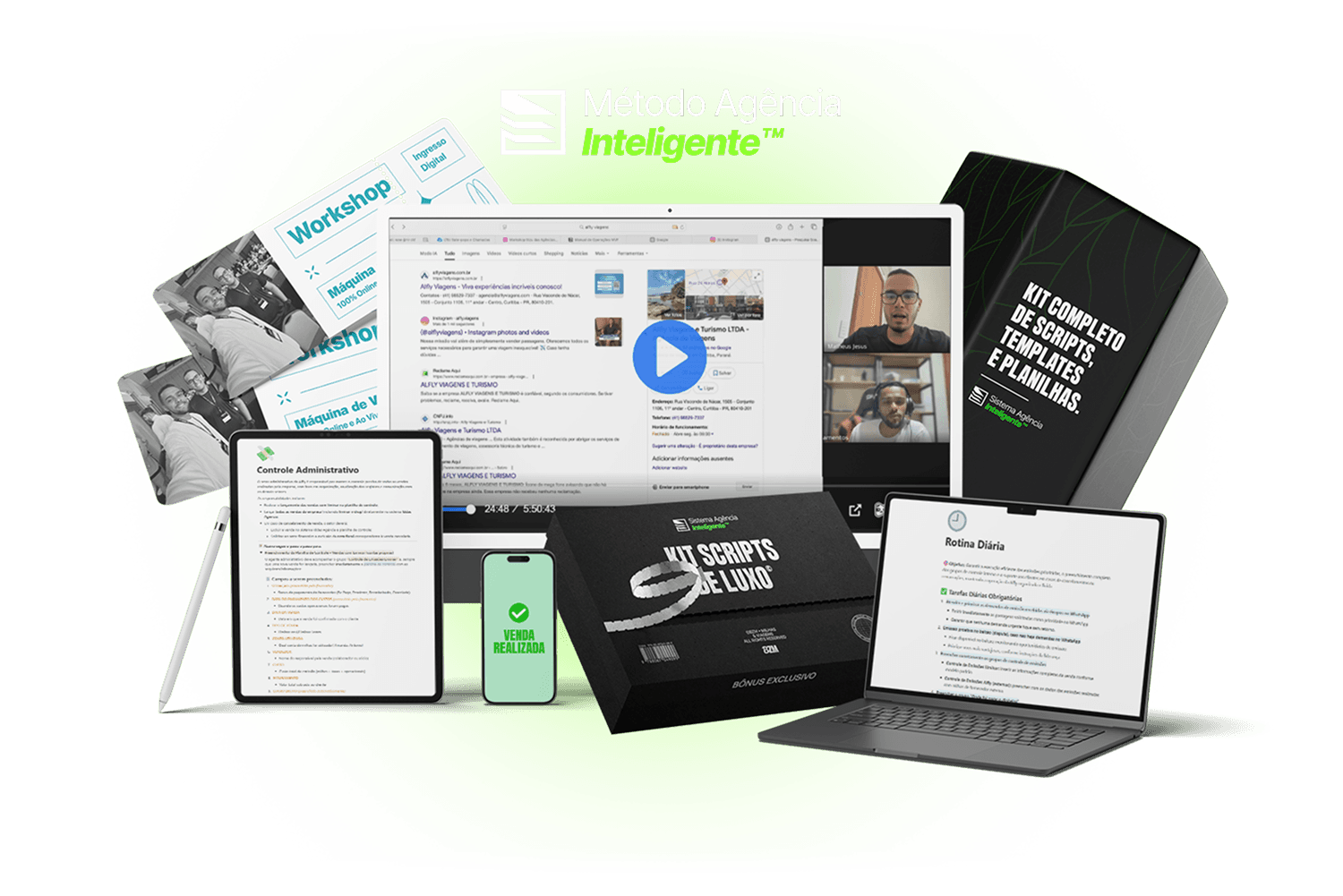 Você recebe um método completo e comprovado estruturado em 4 pilares, com aulas passo a passo, scripts prontos para copiar e colar, e templates validados para cada área da sua agência. Tudo baseado em metodologia testada com mais de 1.500 agências.